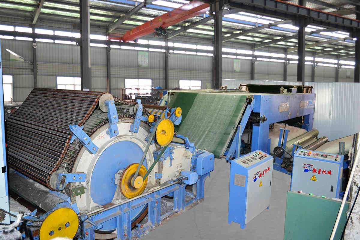 五、磨盤定型運(yùn)棉部分:將棉紗與棉胎纖維磨合粘牢、起球,增加棉胎強(qiáng)度。采用四個(gè)平鋪磨盤,將棉胎每面揉磨兩次,使棉胎磨合更牢,起球更多,強(qiáng)度更高。